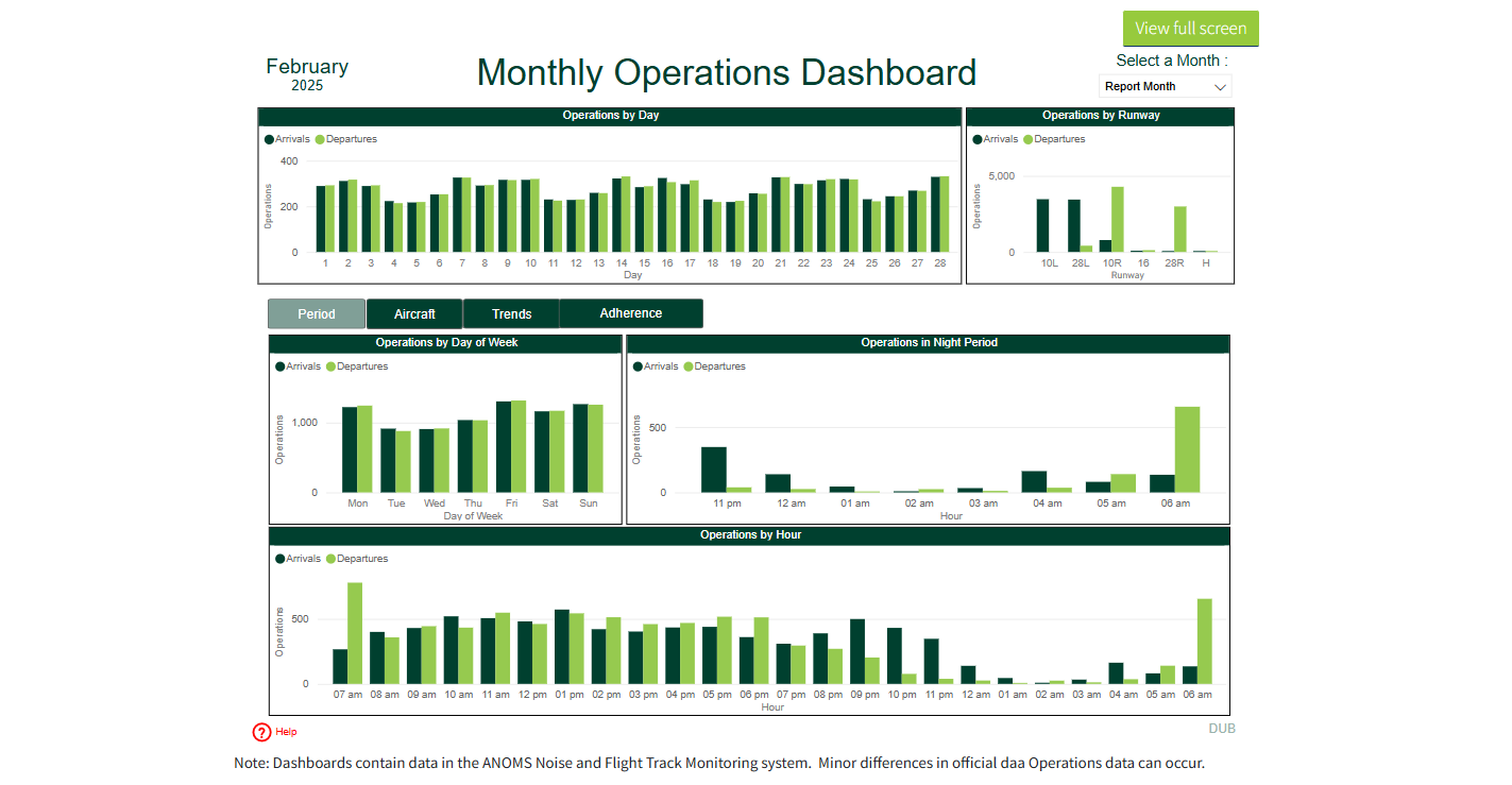 View past flight activity at Dublin Airport with interactive dashboards that track arrivals, departures, aircraft types, and runway usage.